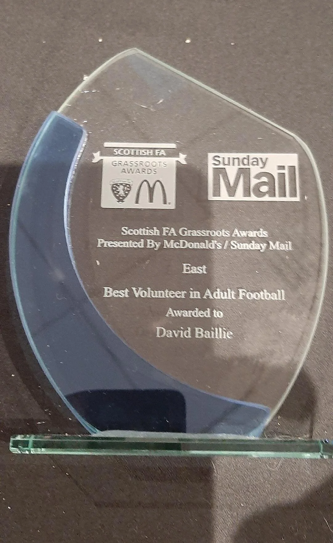 /Congratulations to our Chairman Dave Baillie presented with his SFA award at Tannadice today by Gavin Tindley for Best Volunteer in Adult Football… 46 years and counting. Well done Davie, Legend!